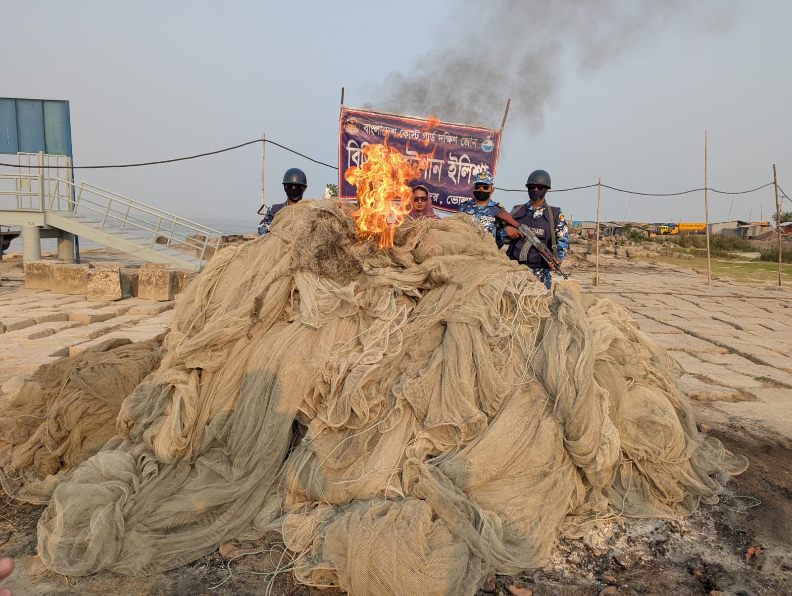 মৎস্য অভিযানের ১৮ তম দিনে ভোলায় মেঘনা নদীতে বিপুল পরিমান অবৈধ জাল জব্দ