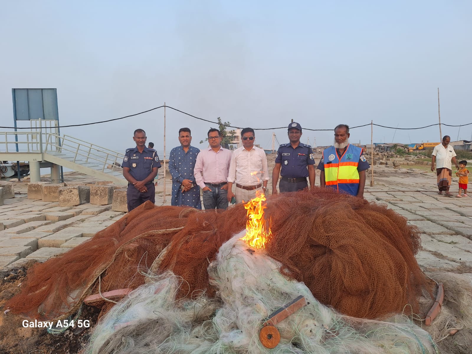 ইলিশা নৌপুলিশ ফাঁড়ির সদস্যদের সহযোগিতায় পরিচালিত অভিযান শেষে জব্দকৃত অবৈধ জাল এবং খুঁটি বিধি মোতাবেক জনসমক্ষে পুড়িয়ে বিনষ্ট করা হয়েছে।