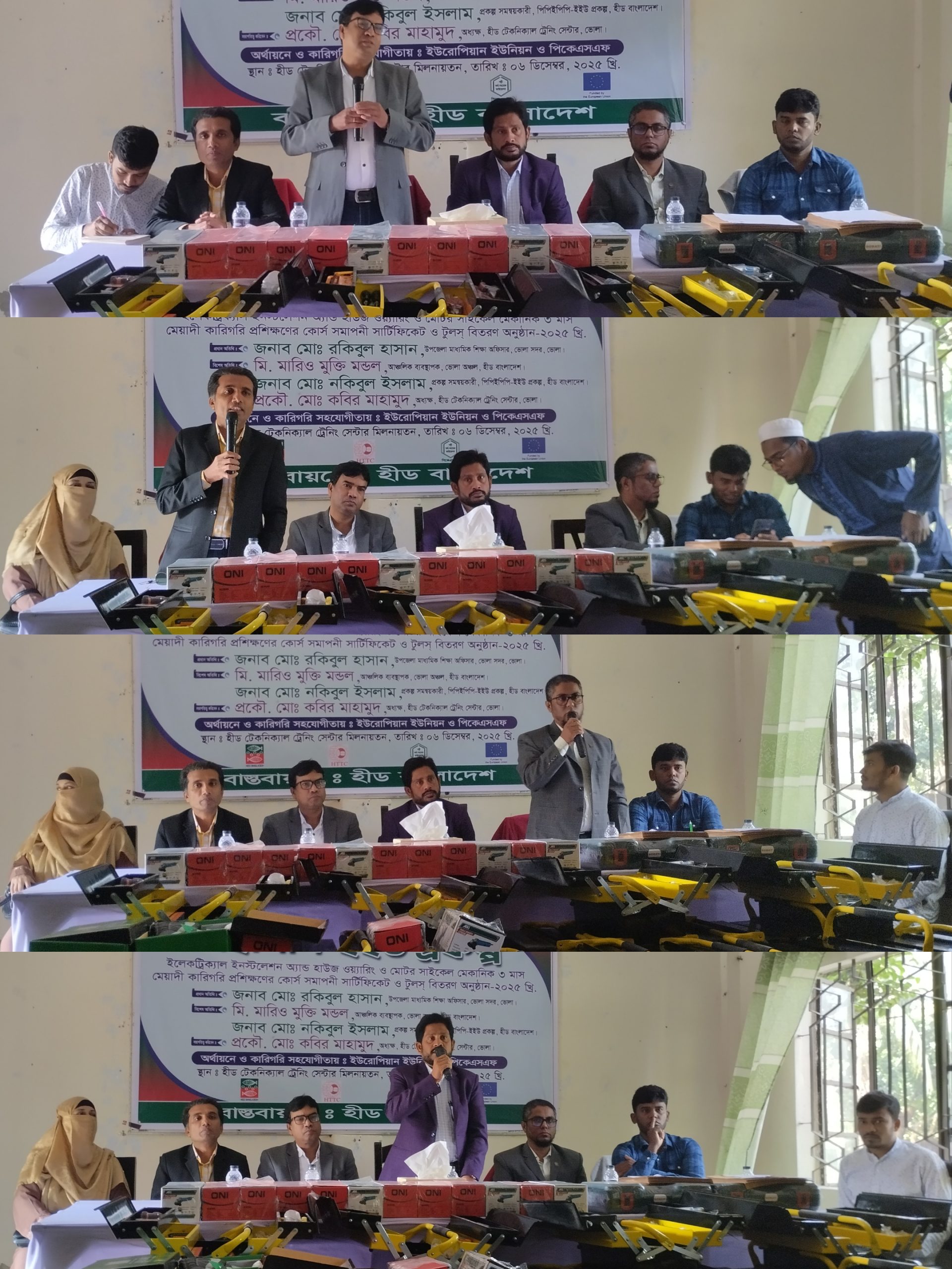 হীড টেকনিক্যাল ট্রেনিং সেন্টারের অধ্যক্ষ প্রকৌশলী মোঃ কবির মাহামুদ এর সভাপতিত্বে অনুষ্ঠিত সমাপনী অনুষ্ঠানে উপস্থিত শিক্ষার্থীদের উদ্দেশ্যে বিশেষ অতিথি হিসেবে বক্তব্য রাখেন সাংবাদিক এ.সি.ডি.অর্জুন,পিপিইপিপি-ইইউ প্রকল্প সমন্বয়কারী মোঃ নকিবুল ইসলাম,ম্যানেজিং কমিটির একজন নারী সদস্য ও প্রতিষ্ঠানটির শিক্ষক মোঃ পারভেজ।